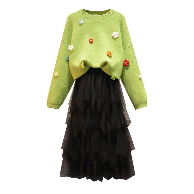 Promo 5XL ladies loose sweater + fashion flower gauze skirt two-piece suit