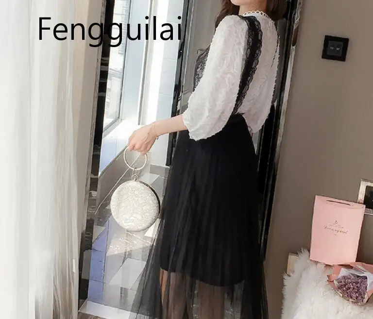 Sale New Fashion White Embroidery Lace Mesh Women Long Sleeve Elegant Dresses Set Sexy O-Neck Elegant Mini Loose Party Dress 2 Pieces