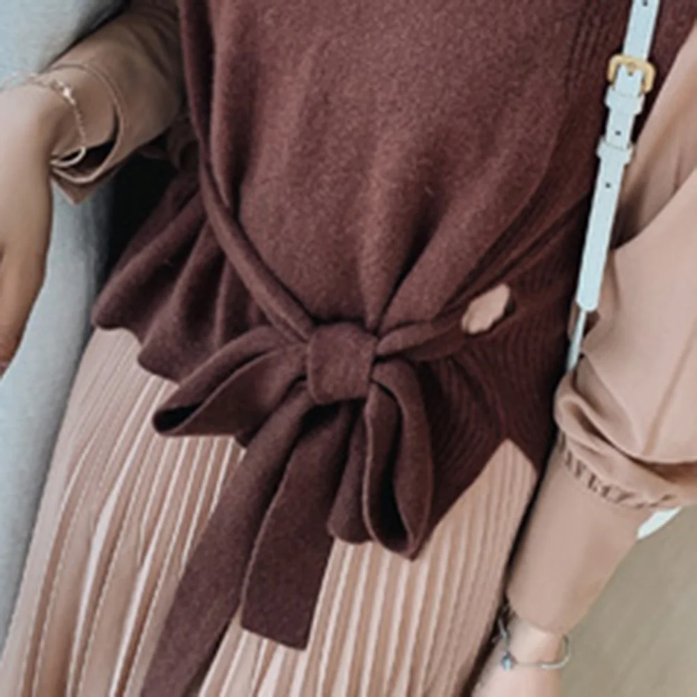 Promo Autumn Two Piece Sets Women Lace-Up Knitted Sweater Vest and Basic Pullover Long Pleated Dress Korean Vintage Boho 2 Pieces Suit