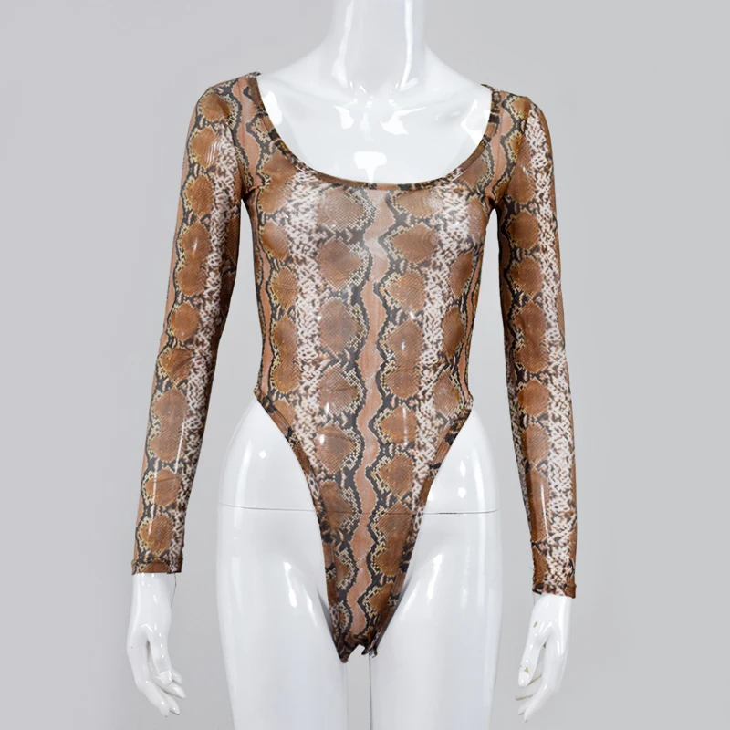 Sale NewAsia Garden See Through Mesh Bodysuit Women Body Mujer Python Print Long Sleeve Sexy Bodysuits Casual Animal Print Jumpsuit