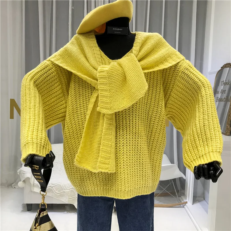 New Scarf+sweater Women Fashion Designer V-Neck Casual Loose Solid Warm Women's Sweaters with Long Sleeves Pullovers and tops