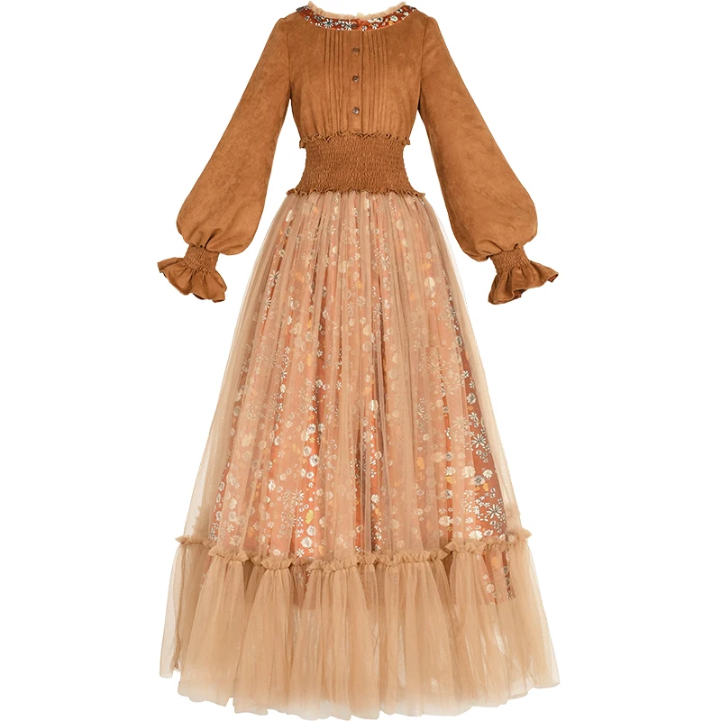 Get this Free Shipping Boshow 2019 New Autumn Women Suede And Gauze Patchwork One-piece Long Maxi Print Flower Long Lantern Sleeve Dress with limited time discount by pressing the button below